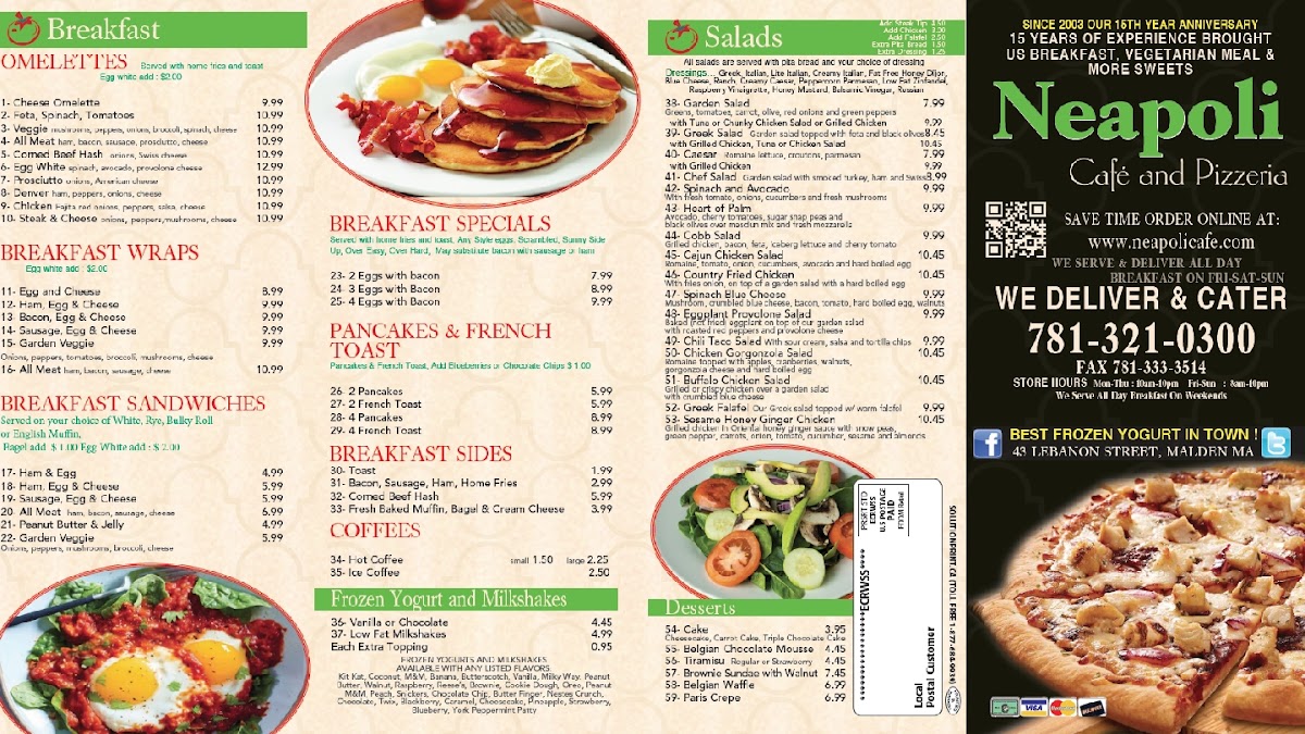 To round off your dining experience, the dessert menu features delicious options like Tiramisu and Cannoli, perfect for anyone with a sweet tooth. Whether you're in the mood for a casual meal or a more refined dining experience, Neapoli Cafe & Pizzeria’s menu offers something for everyone, ensuring a memorable visit every time.